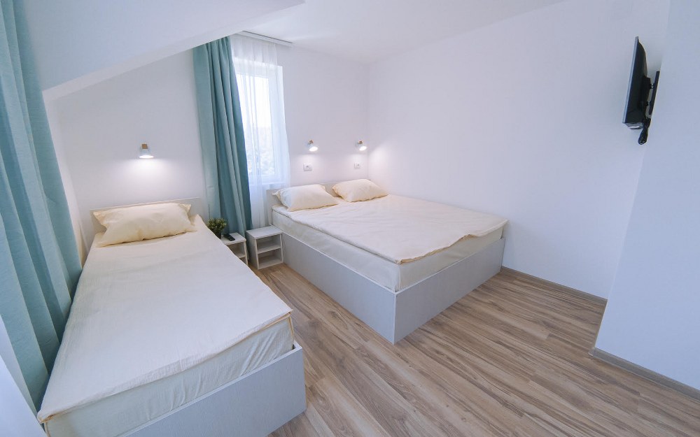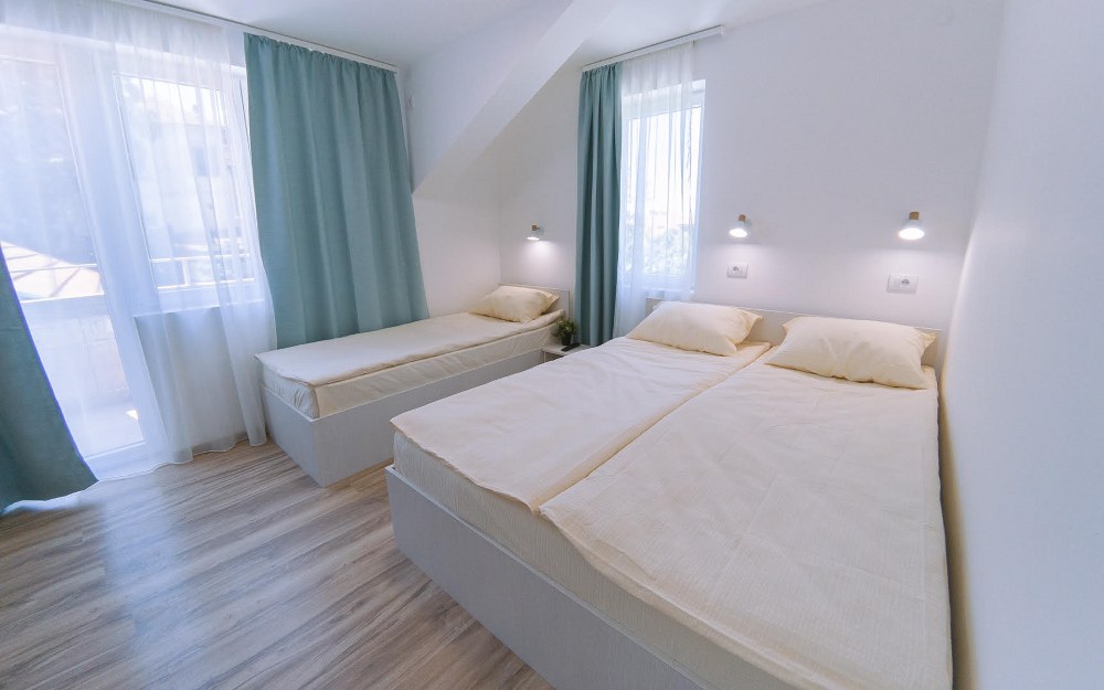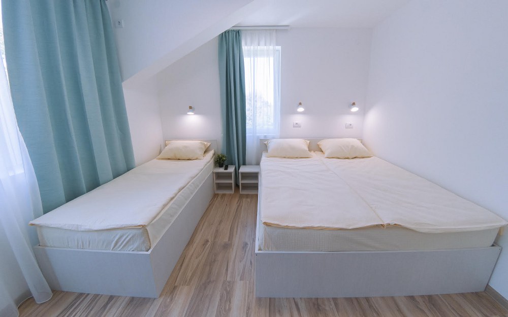 Obuhvata: Raspolaže sa jednim francuskim i jednim singl ležajem za smeštaj do tri osobe. Ima sopstveno kupatilo, čajnu kuhinju sa aspiratorom i frižiderom, sto i stolice, noćne ormariće, garderober, TV , Wi-Fi internet i ima sopstvenu terasu površine 3,3m2.