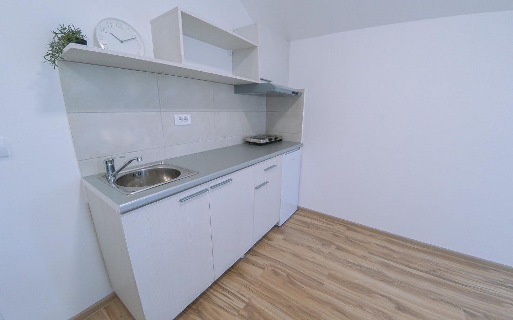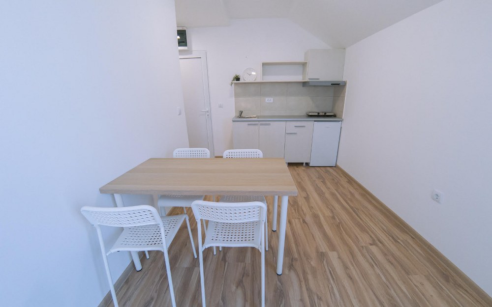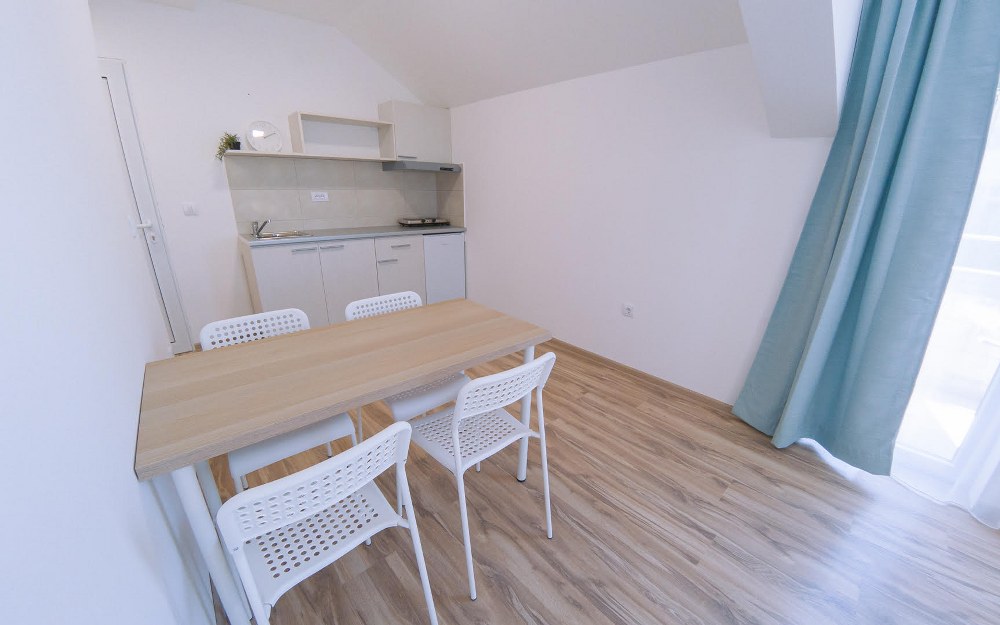 Studio Kruška 3 se nalazi na trećem spratu i površine je 26m2. Orijentisan je zapadno sa pogledom na Crkvu Sv. Preobraženja Gospodnjeg.